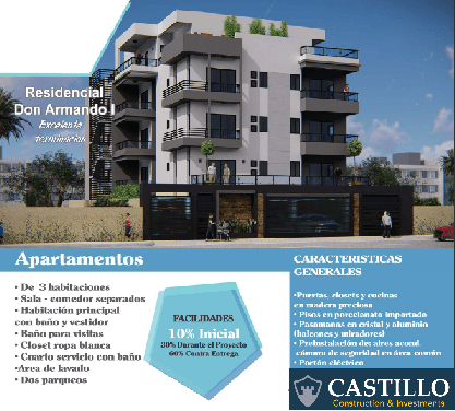 Aprovecha las ofertas de pre-ventas! Amplio apartamentos disponibles en residencial completamente cerrado. Proyecto ubicado en el sector Cacique. Próximo al mar (malecón) 3 habitaciones 2 baños sala, comedor, balcón, cocina, área de lavado, cuarto de servicios Habitación principal con baño Estudio 101 m2 (neto) Parque techado Cuarto de servicio con baño Portón eléctrico, Gas Común,Planta electrica ,Terminación en madera preciosa Precios desde USD $115,000 Fecha de entrega: Agosto 2019 Facilidades: 10% Inicial, 30… Leer Más